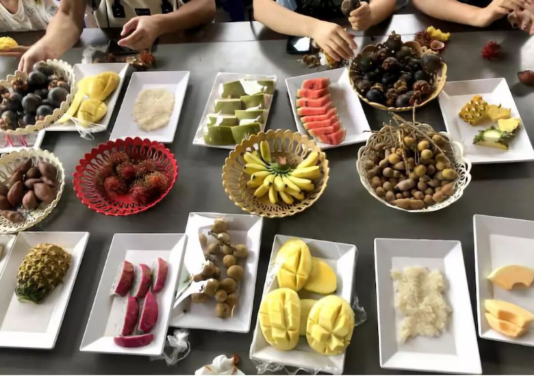开始吃吃吃啦~~~当季时令水果应有尽有:榴莲、山竹、酸角果、芒果、龙宫果、龙眼、菠萝、哈密瓜、蛇皮果、红毛丹、火龙果,多得数不清了!大家尽情享用,一饱口福!